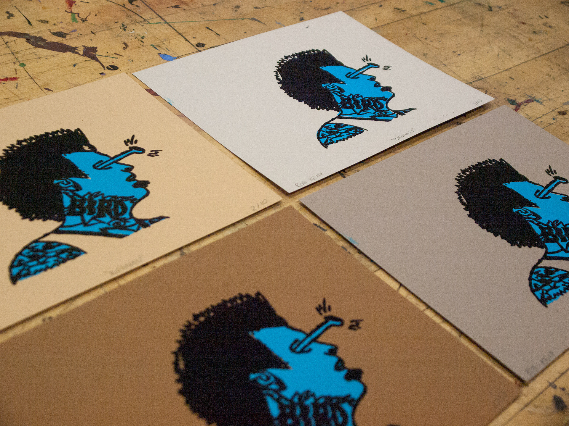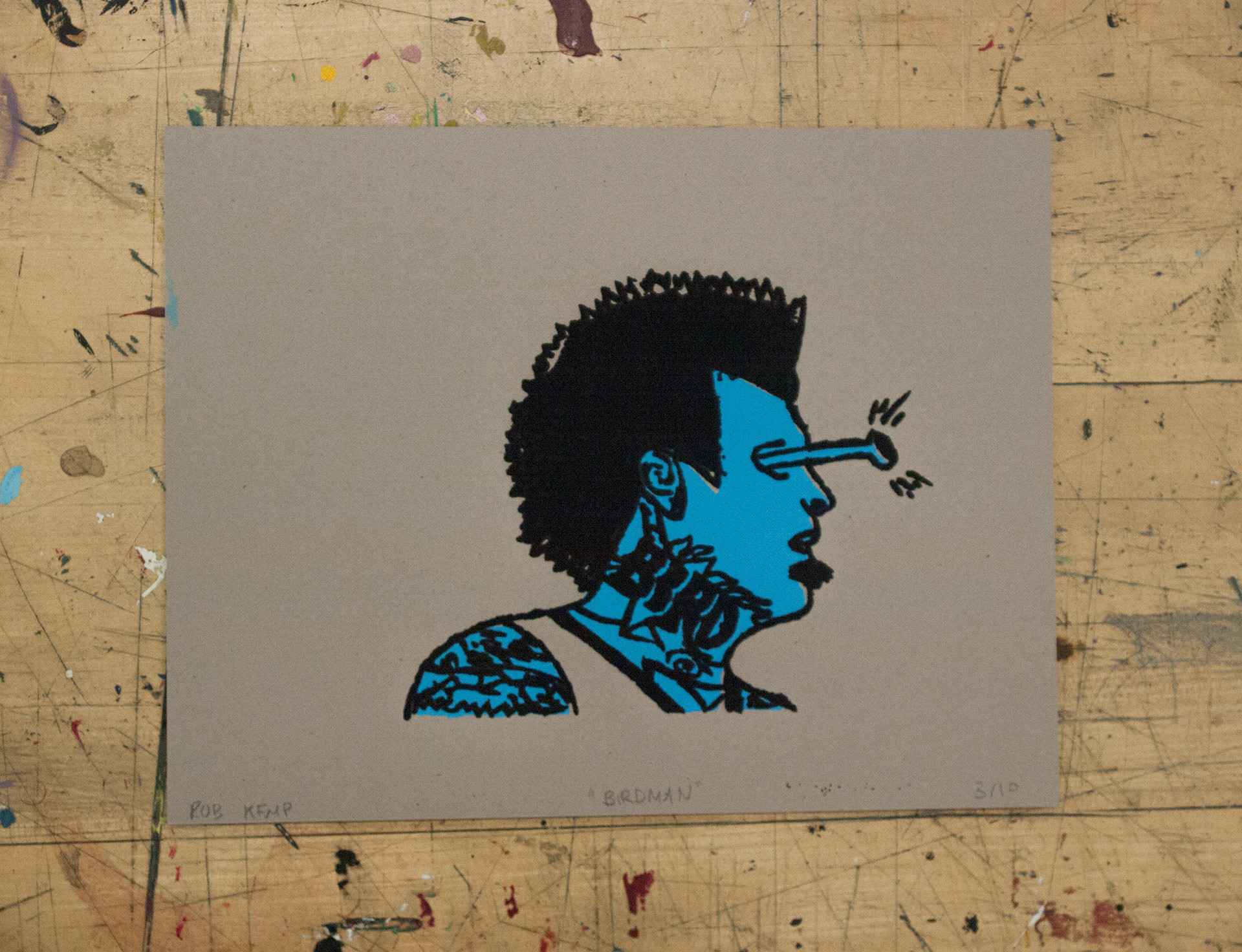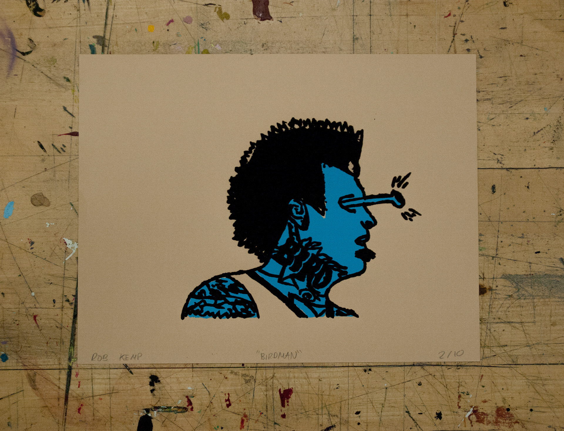 Silkscreen prints, completed using drawing fluid on 4 different paper stocks, modeled after NBA player Chris "The Birdman" Andersen. Edition of 10.