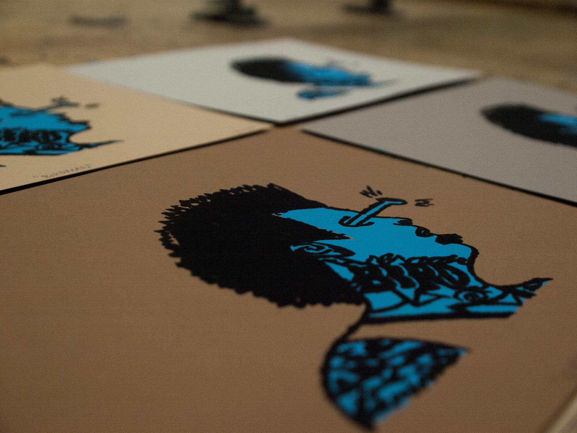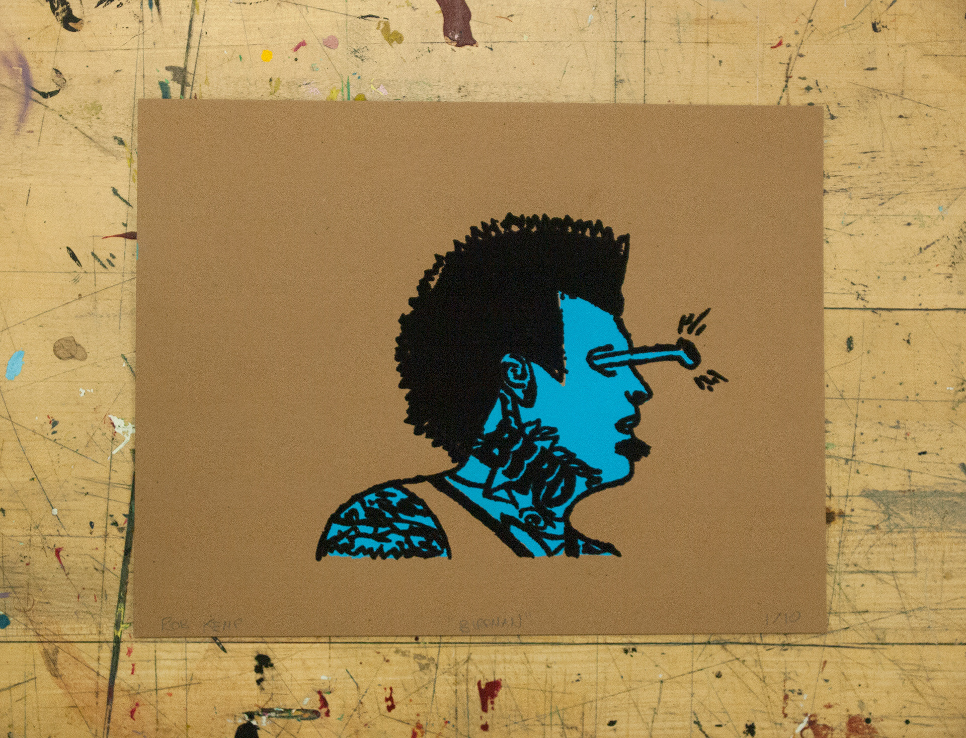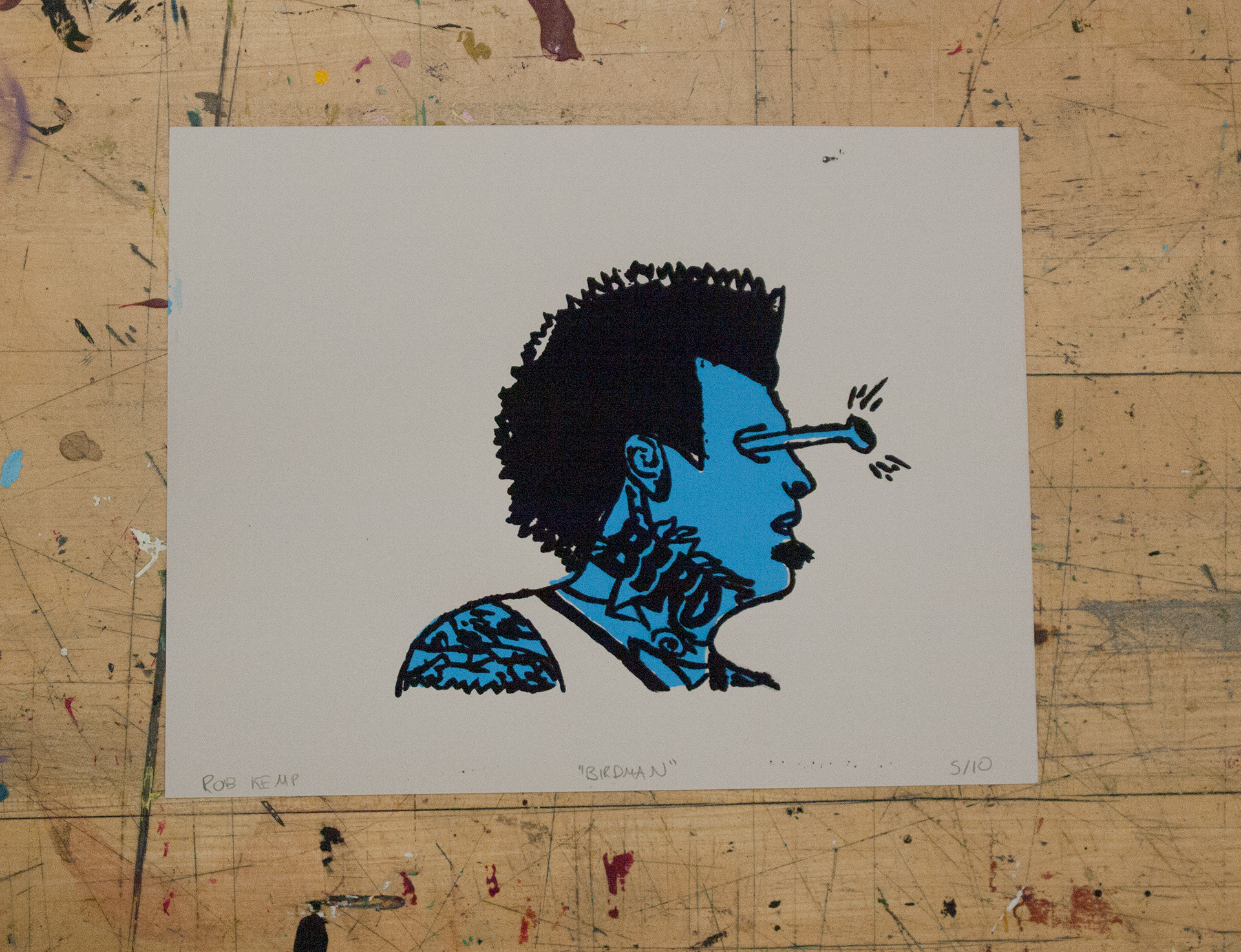 Silkscreen prints, completed using drawing fluid on 4 different paper stocks, modeled after NBA player Chris "The Birdman" Andersen. Edition of 10.