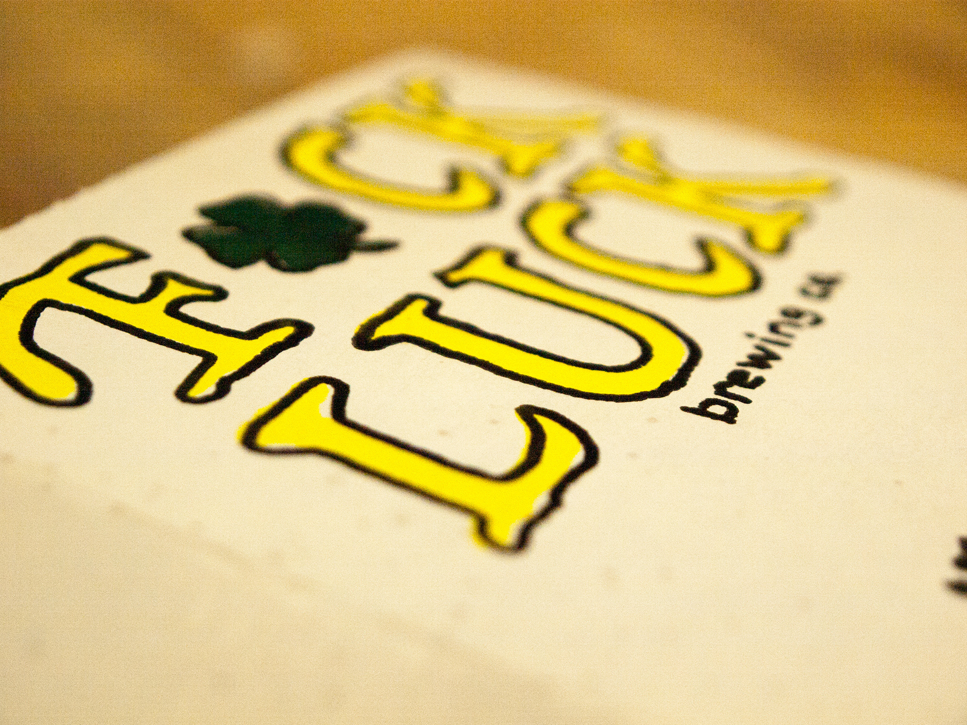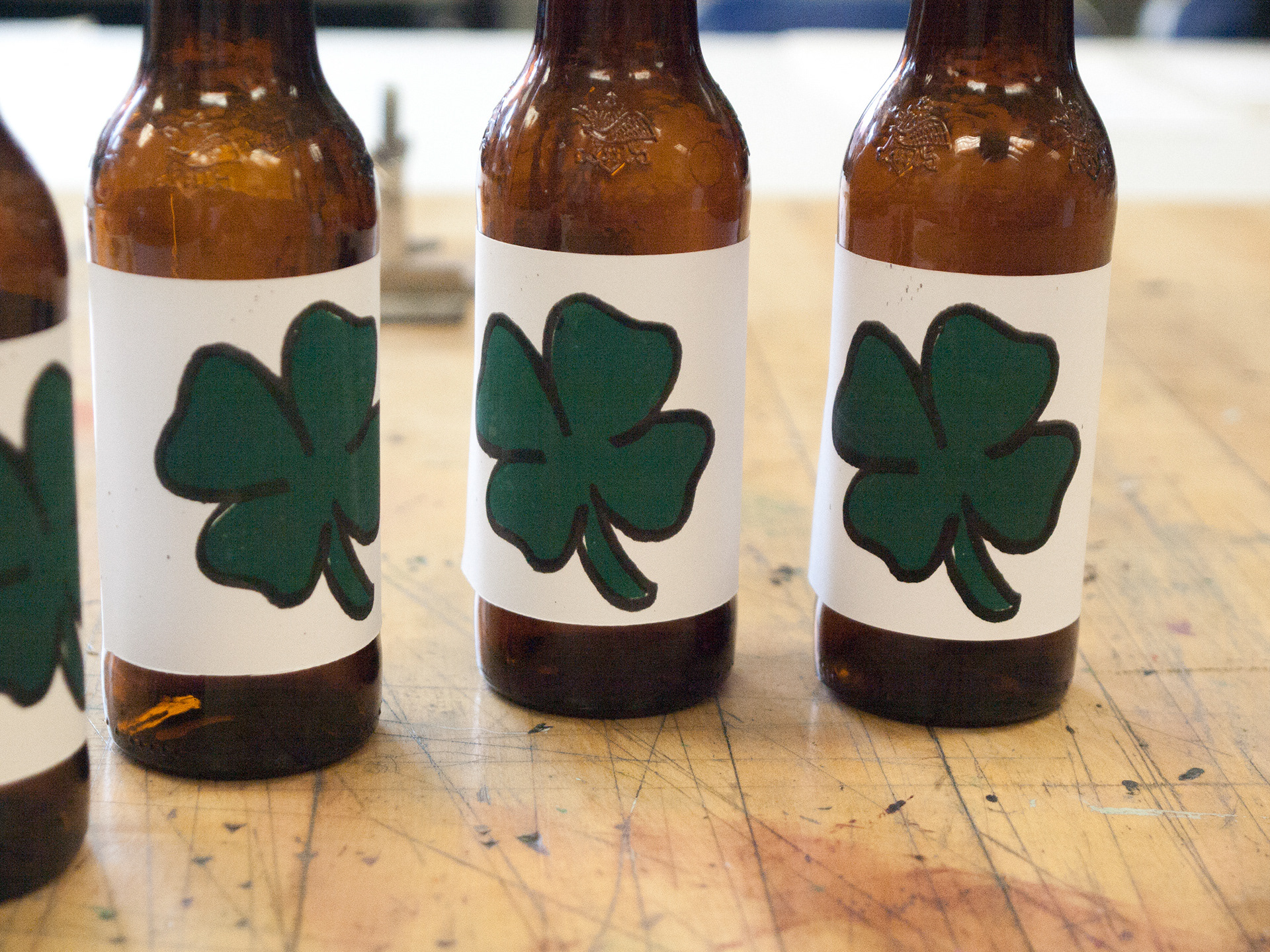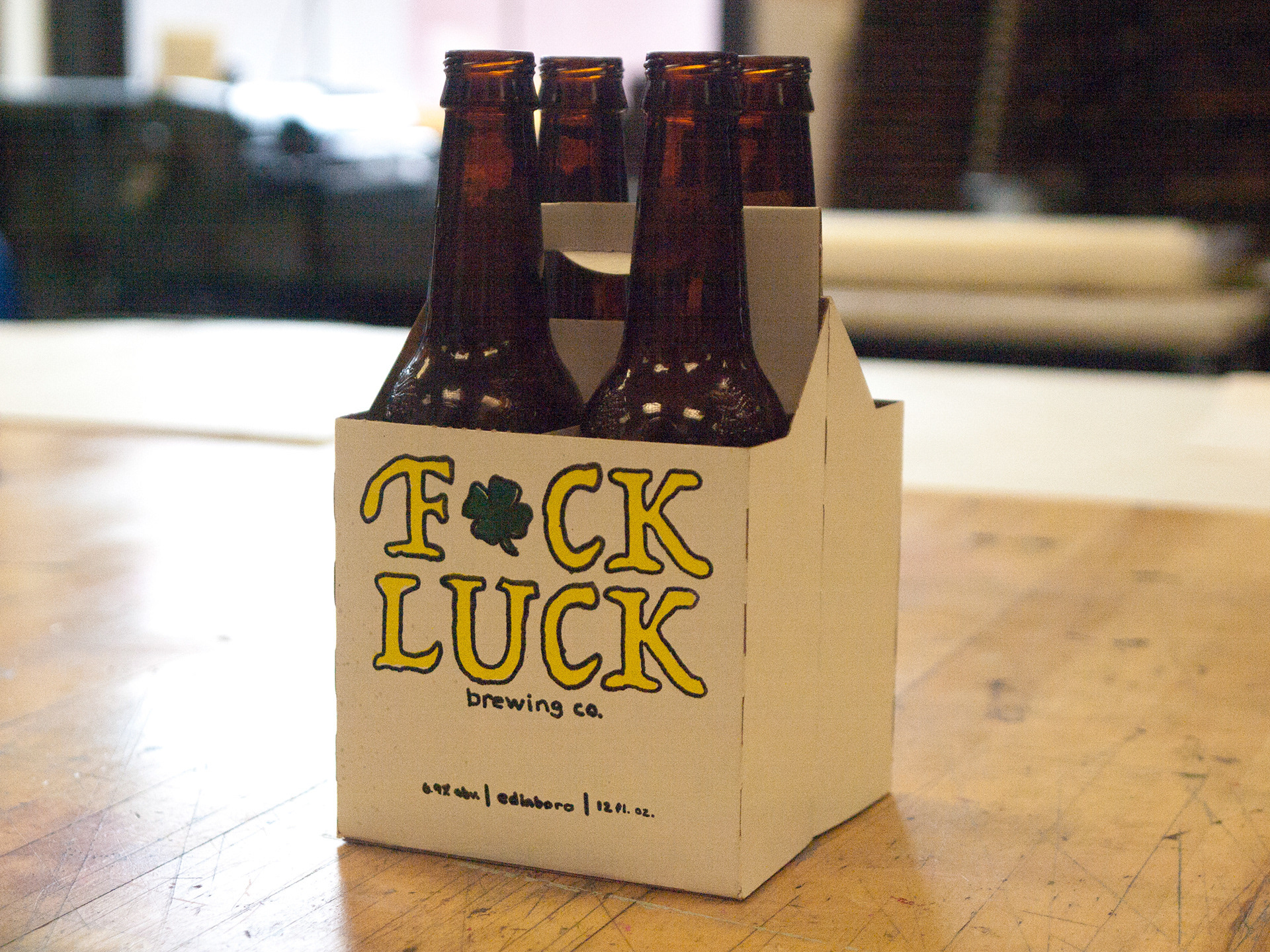 Fictional brewing company, done using tracing paper on photo emulsion. Printed on beer bottles and blank six-pack carrying cases.