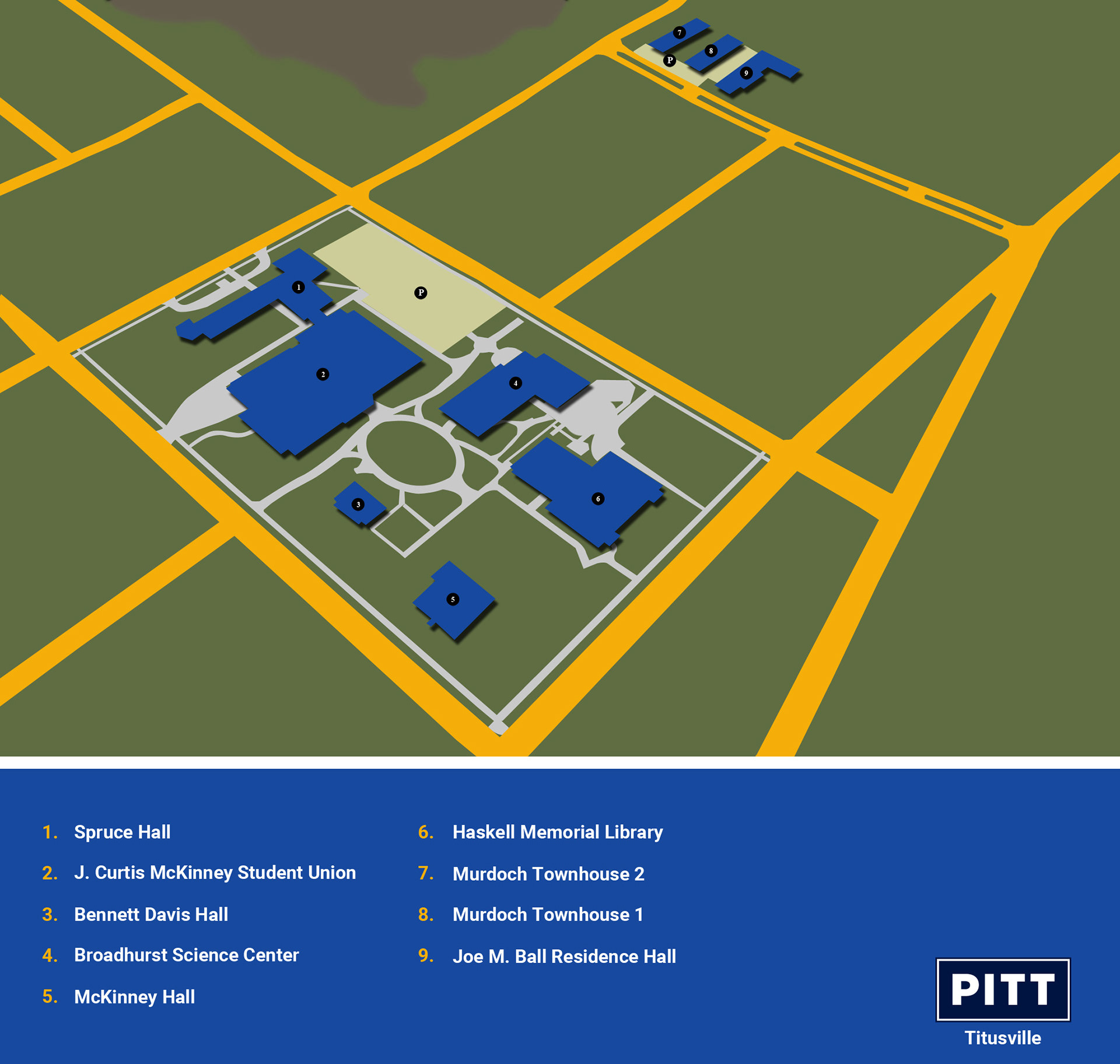 New campus maps for the University of Pittsburgh and satellite campuses. Campus maps featured are Oakland, Johnstown, Titusville, Greensburg, and Bradford. Created using 3D modeling software and Adobe CS5.
