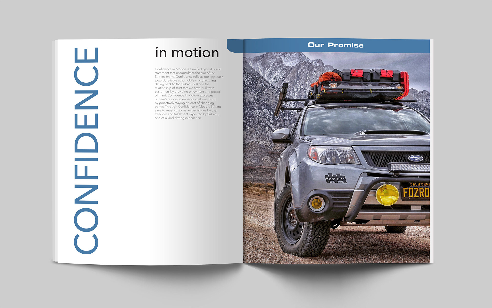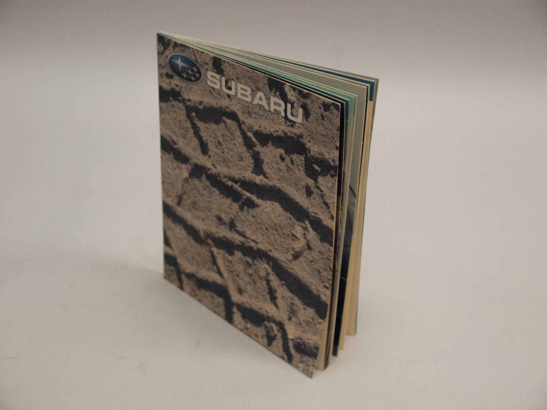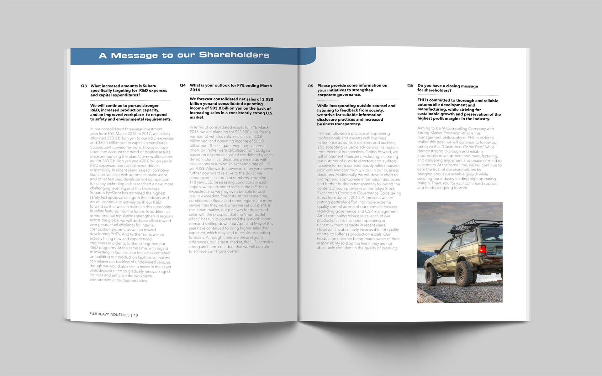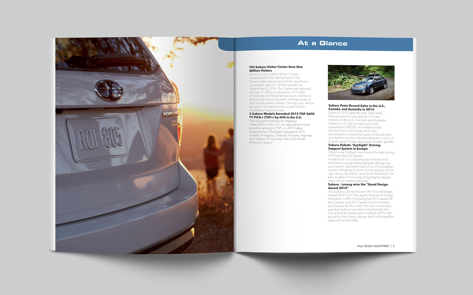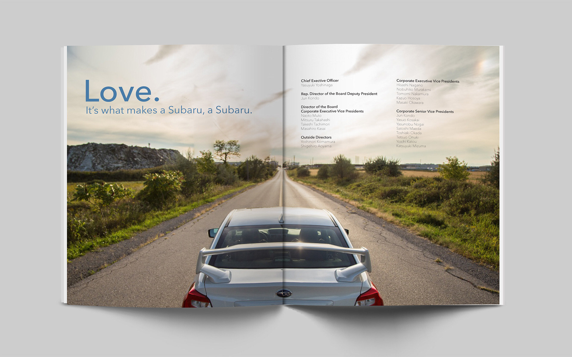 2015 Subaru Annual Report redesign, utilizing content in the original report. Developed to coincide with the Subaru initiative for environmentally conscious and sustainable practices, this publication speaks to both shareholders and Subaru drivers.
